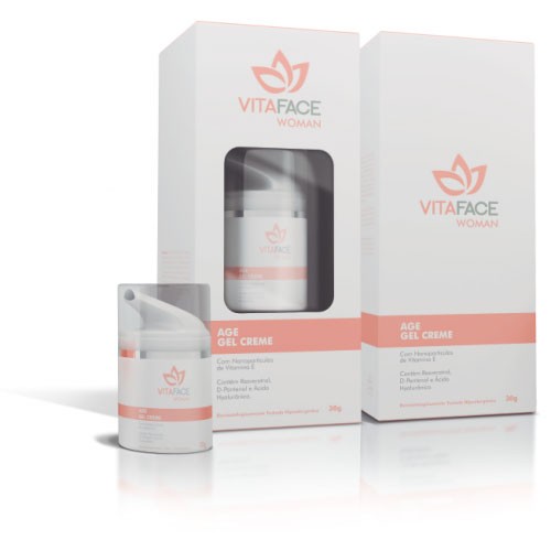 VITAFACE WOMAN AGE GEL CREME possui o Resveratrol, poderoso antioxidante oriundo do vinho tinto, o D-Pantenol, agente com alto poder de nutrição da pele, e o Acido Hyalurônico, capaz de hidratar e aumentar a elasticidade da pele. Possui também Nanopartículas de Vitamina E, potente antioxidante de ação dérmica
